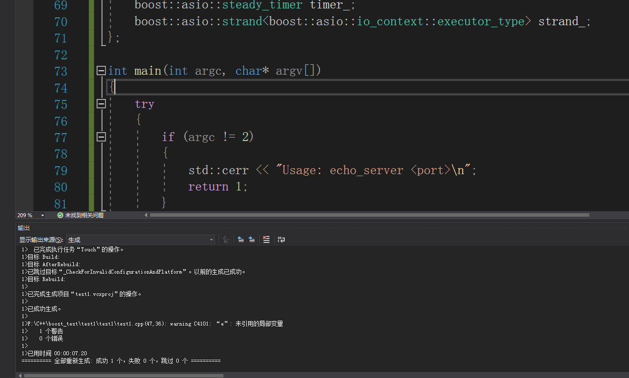 这样完成了我们对环境的检测,说明Asio的环境没有问题。下面我们就接着去了解Asio库。
