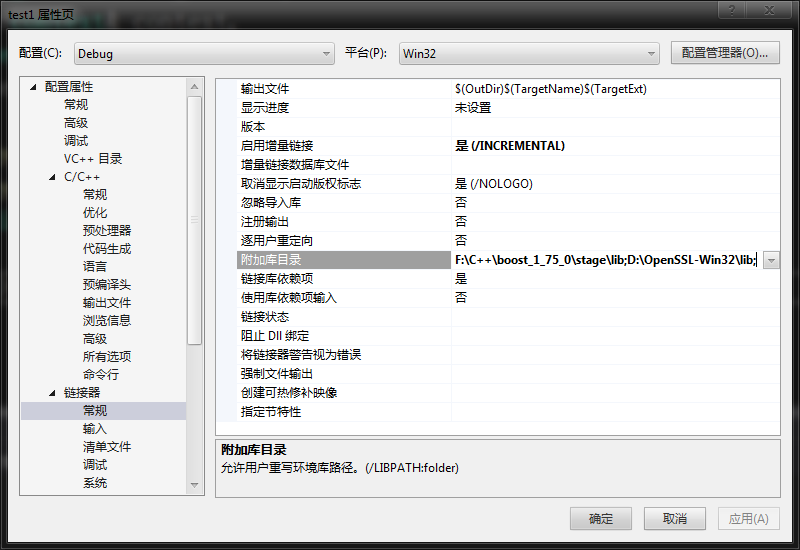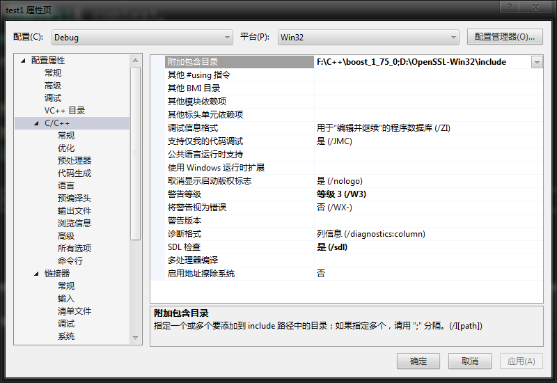 我们再尝试链接OpenSSL ,首先在项目中设置openSSL的头文件目录: