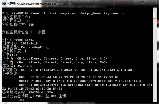 1 | keytool -list -keystore ./https_demo1.keystore -v |