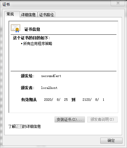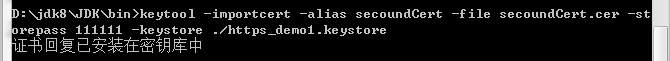 1 | keytool -importcert -alias secoundCert -file secoundCert.cer -storepass 111111 -keystore ./https_demo1.keystore |