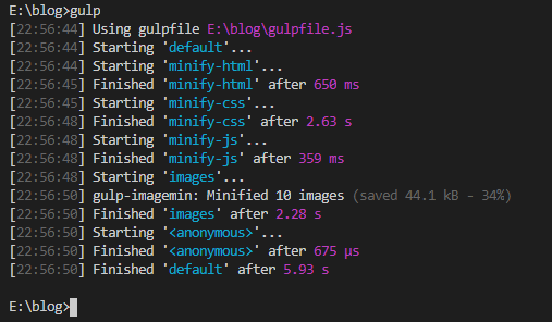 gulp.task('default',gulp.series('minify-html', 'minify-css','minify-js','images', done => done()));先生成博客文章,使用以下命令生成: